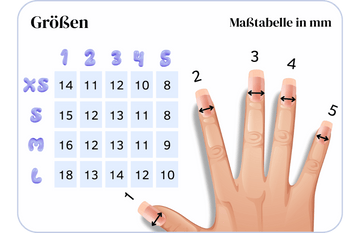 - Wenn Sie zwischen zwei Größen liegen oder flache Nägel haben, sollten Sie eine größere Größe wählen.