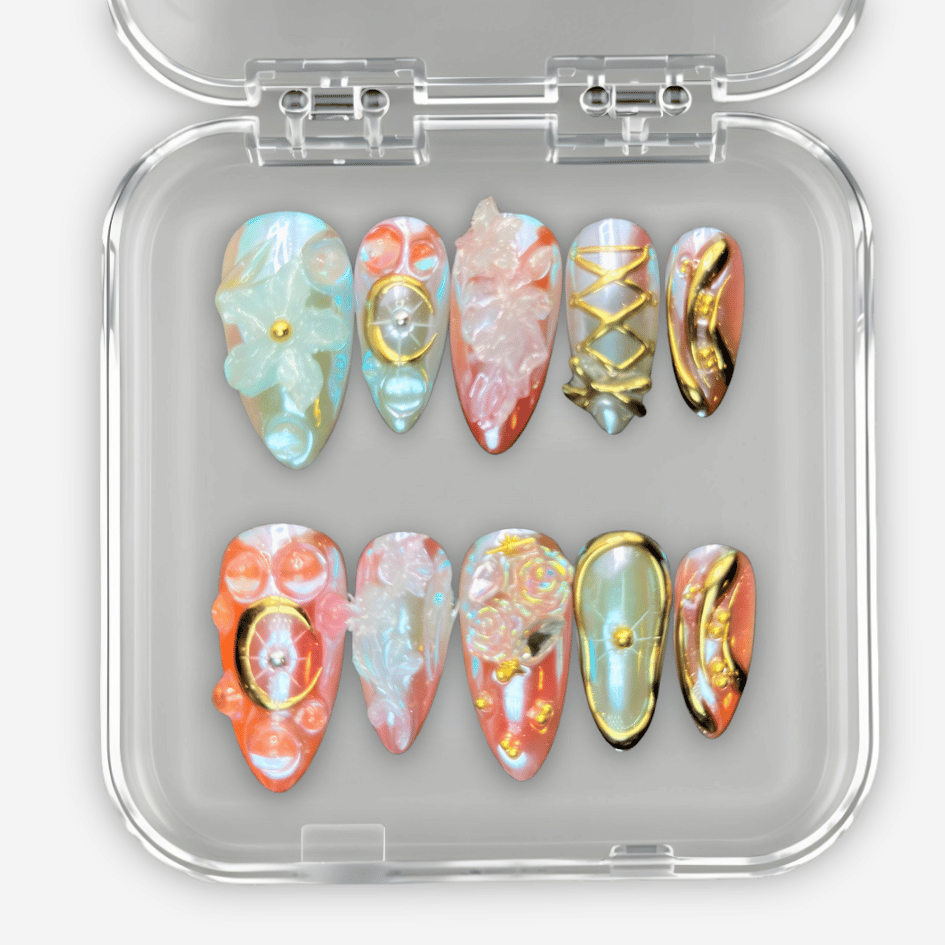 Chacun des 10 ongles de ton set est réalisé avec soin et amour, grâce à un processus minutieux.